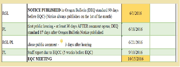 | 18 | EH | Notice Published in Oregon Bulletin (DEQ standard 90 days before EQC) | 5/1/2017 |