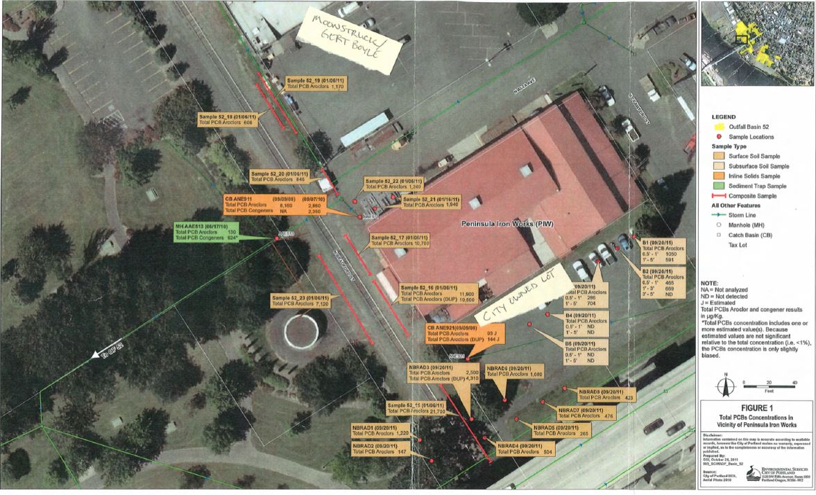 ECSI6480 Date: 2011-10-28 Caption: 2011 Total PCBs collected in soil and stormwater sediments by City of Portland.