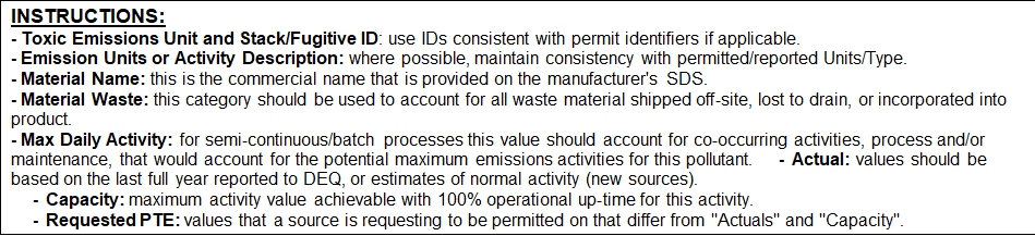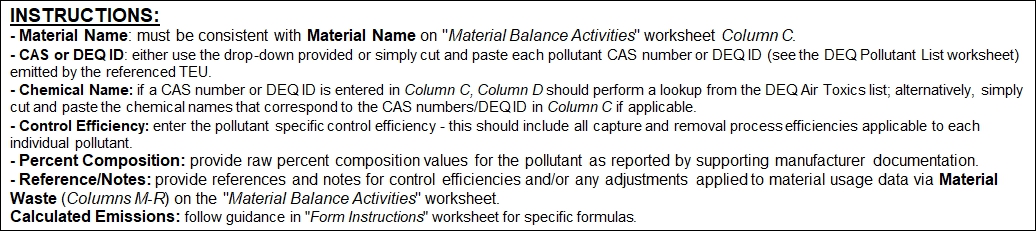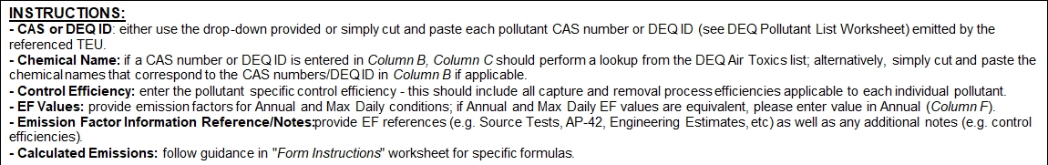 | 47 | 1. Provide a row for each Air Toxic emitted from a specified TEU. Either select a CAS number or DEQ ID from the dropdown list or cut and paste both the CAS/DEQ ID and Chemical Name for each pollutant. | ||||||||||||||||