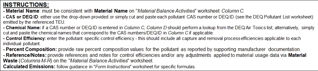 | 18 | Worksheet 5 | Pollutant Emissions - MB | Record all Air Toxic pollutants CAS/DEQ ID and chemical names associated with recorded materials, pollutant-specifc percent composition and control efficiencies, and calculated emissions. | ||||||||||||||