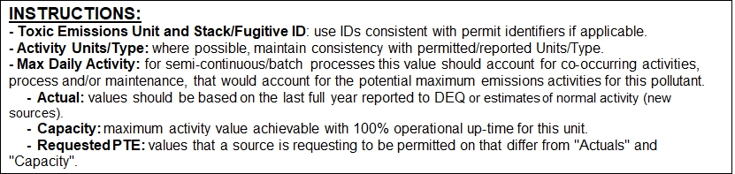 | 47 | 1. Provide a row for each Air Toxic emitted from a specified TEU. Either select a CAS number or DEQ ID from the dropdown list or cut and paste both the CAS/DEQ ID and Chemical Name for each pollutant. | ||||||||||||||||